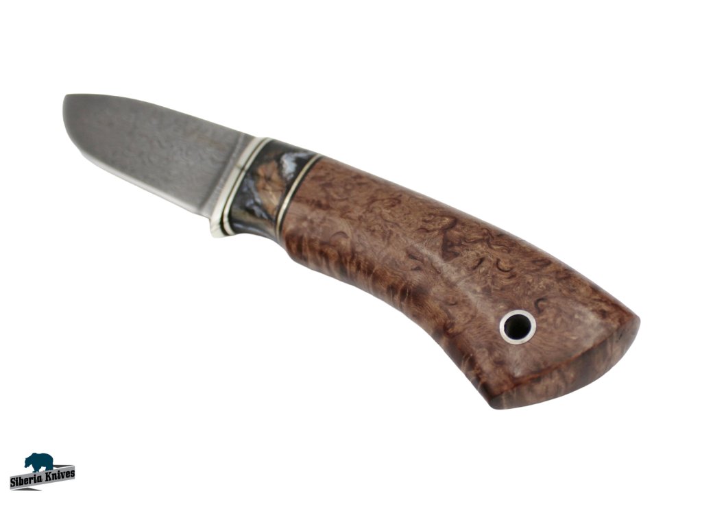 Rukojeť nože: stabilizovaný mamutí zub, stabilizovaná karelská bříza, ocel - kresba každého kusu je jedinečná