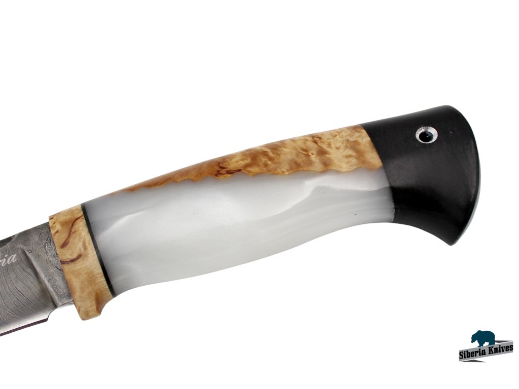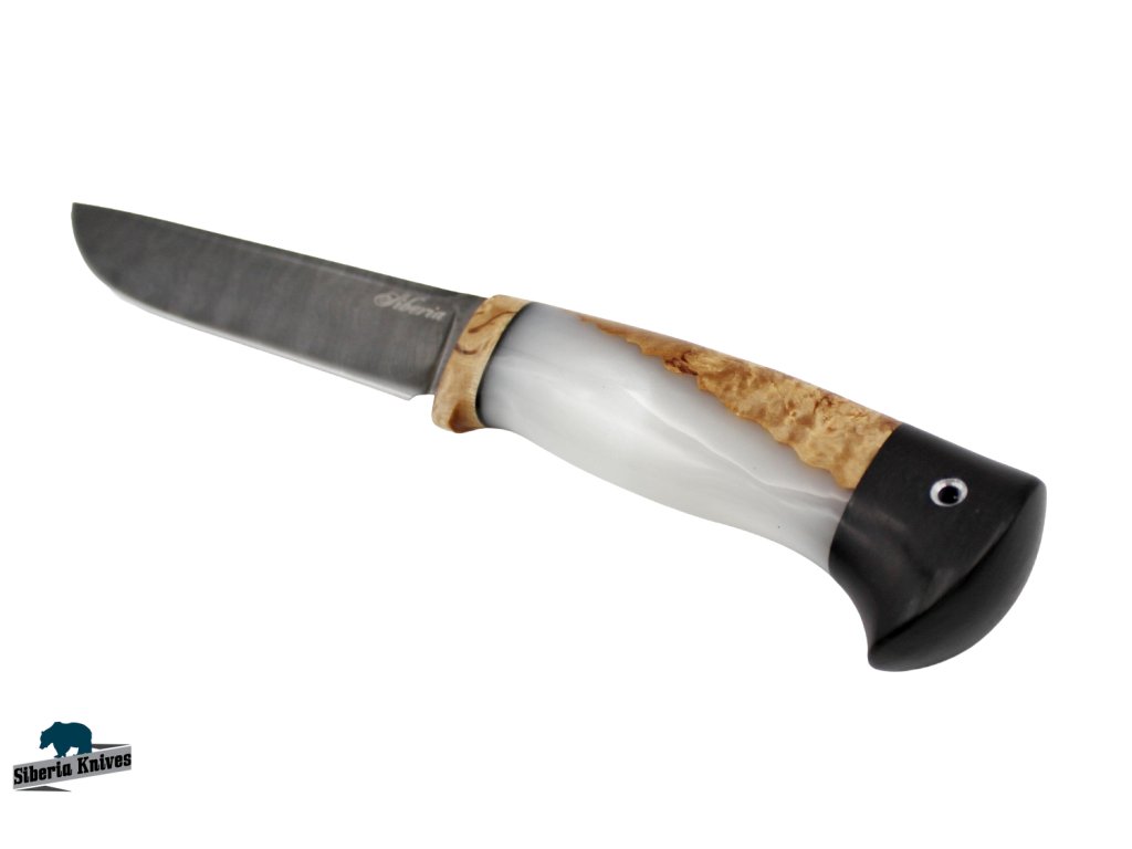 Rukojeť nože: stabilizovaná karelská bříza, habr, mléčný akryl