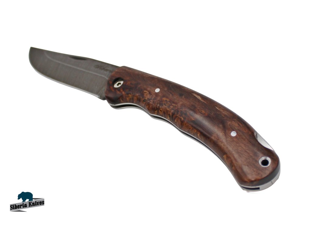 Rukojeť nože: nerezová ocel (vnitřní konstrukce), karelská bříza