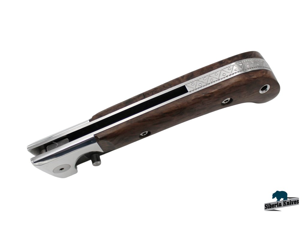 Rukojeť nože: nerezová ocel (vnitřní konstrukce), karelská bříza